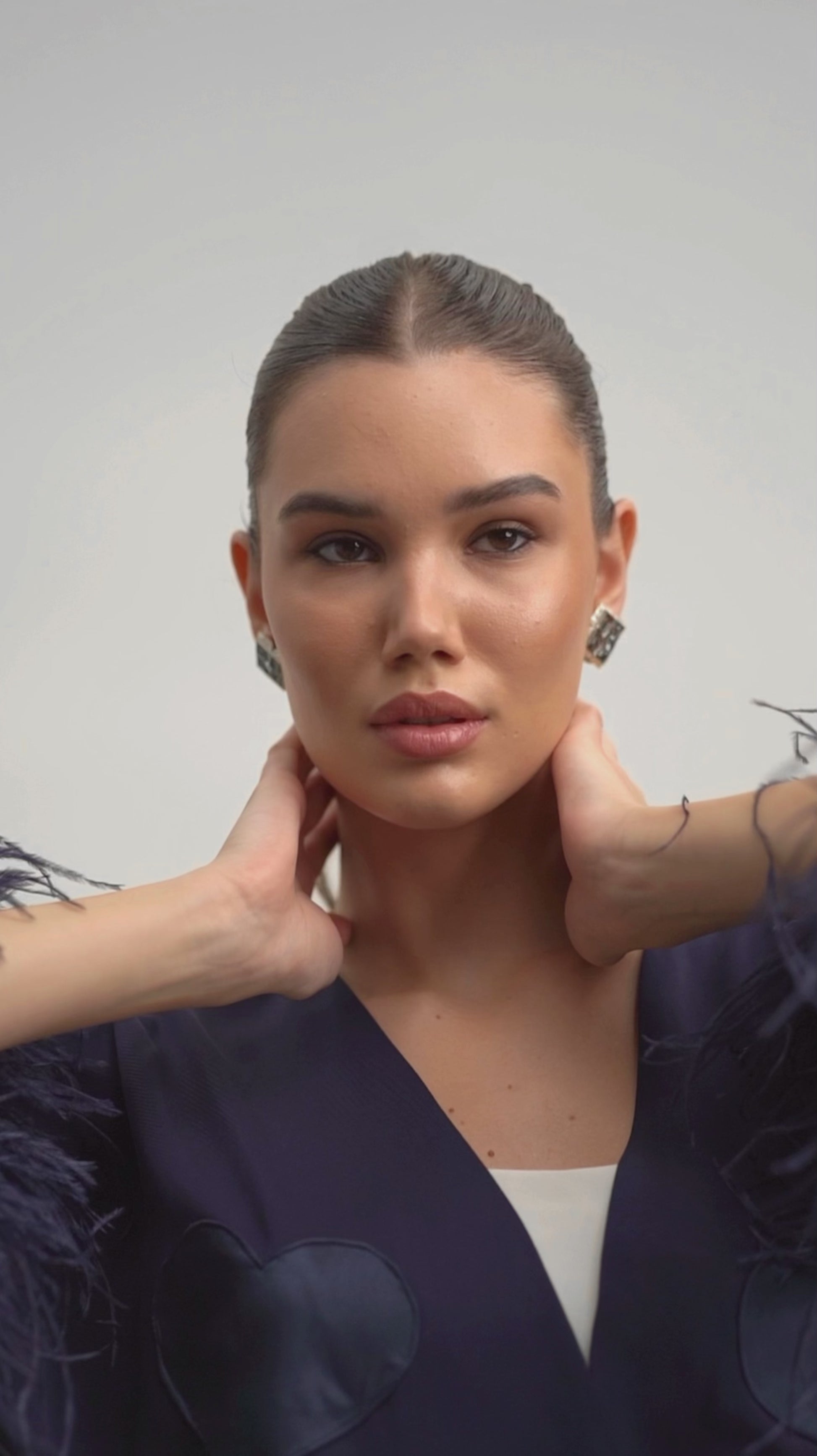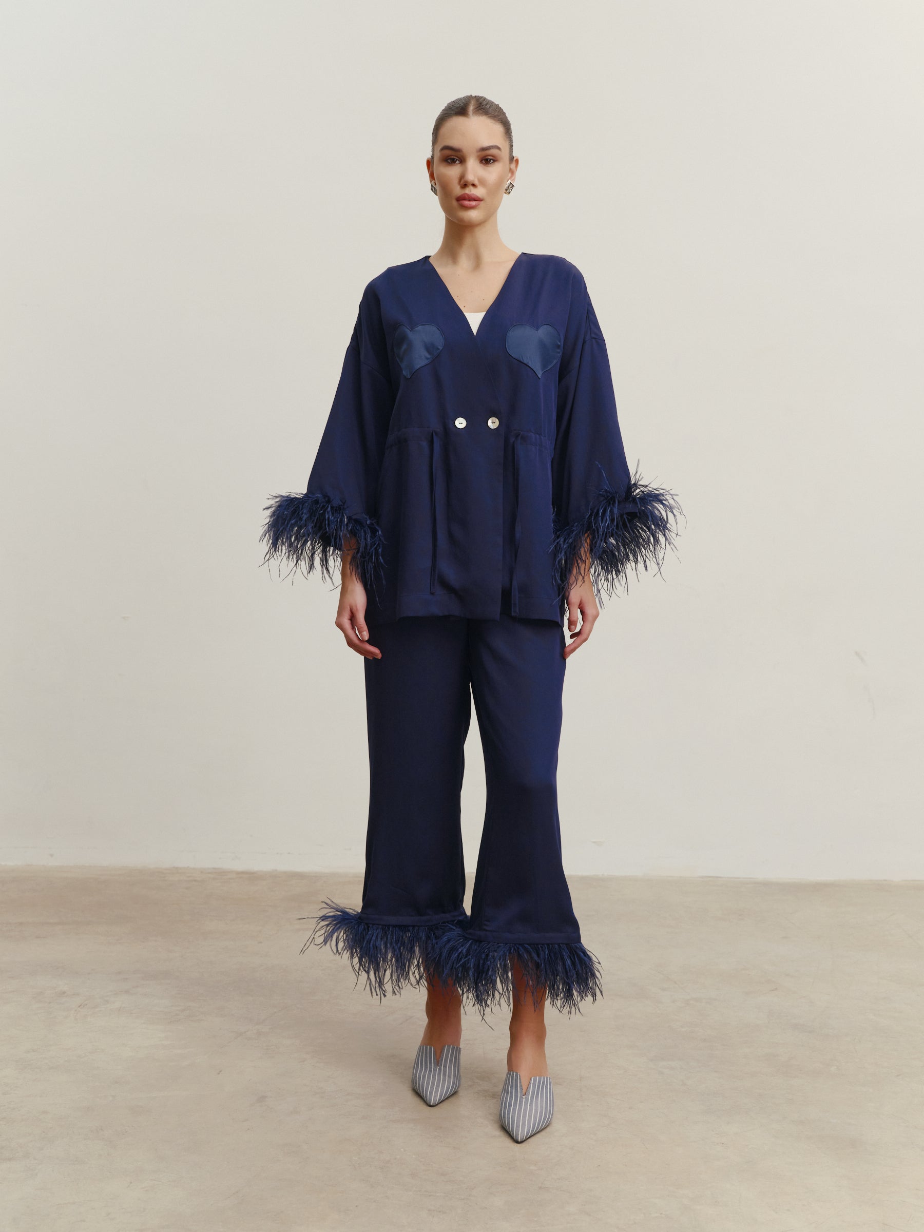 Eucalyptus kimono suit with detachable feathers in navy blue. Adorned with hearts made of natural silk and buttons crafted from natural shell. It can be worn in a loose position as an unlined blazer or tailored as a kimono. The set includes pants with back pockets and an elastic waistband.