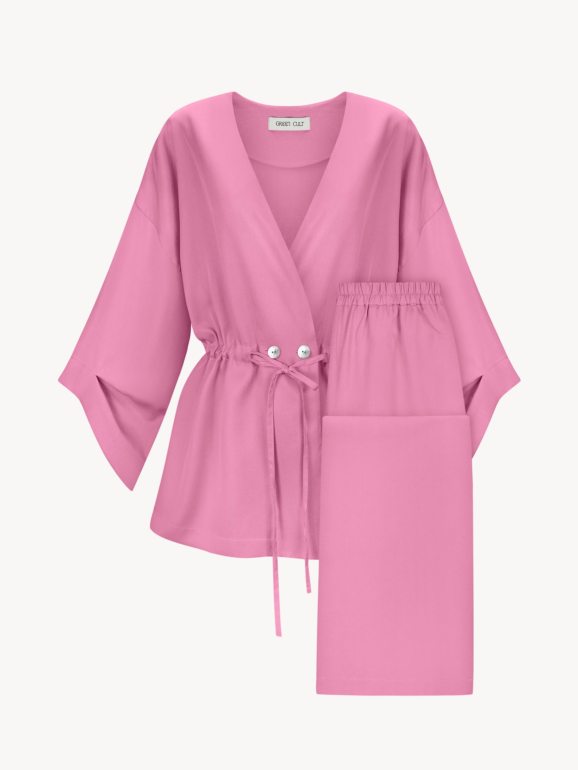 Eucalyptus kimono set in pink, adorned with mother-of-pearl buttons made from natural shell. Can be worn loose like a blazer without lining, or tailored for a more fitted kimono look. The set includes a kimono and pants with pockets and an elastic waistband.