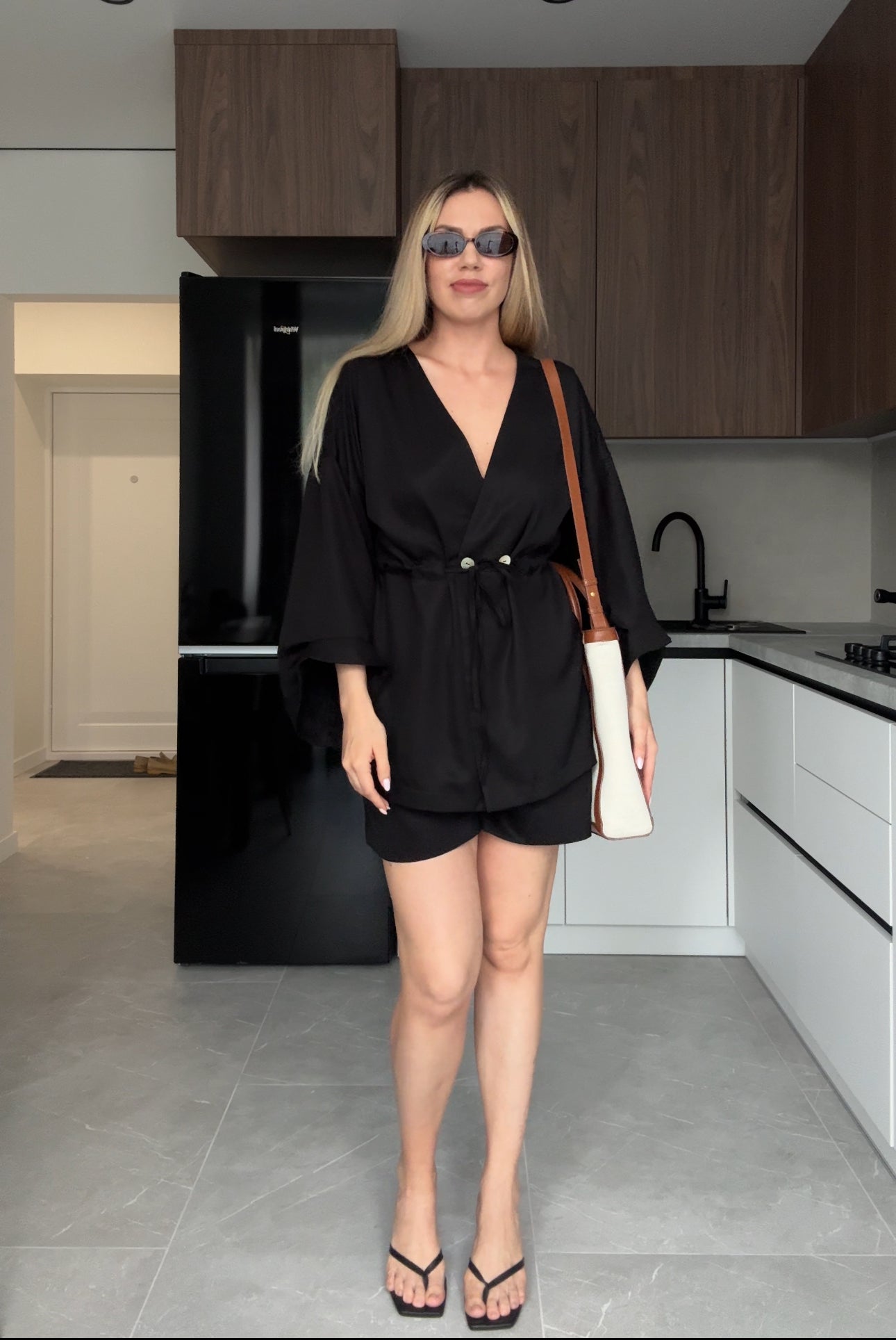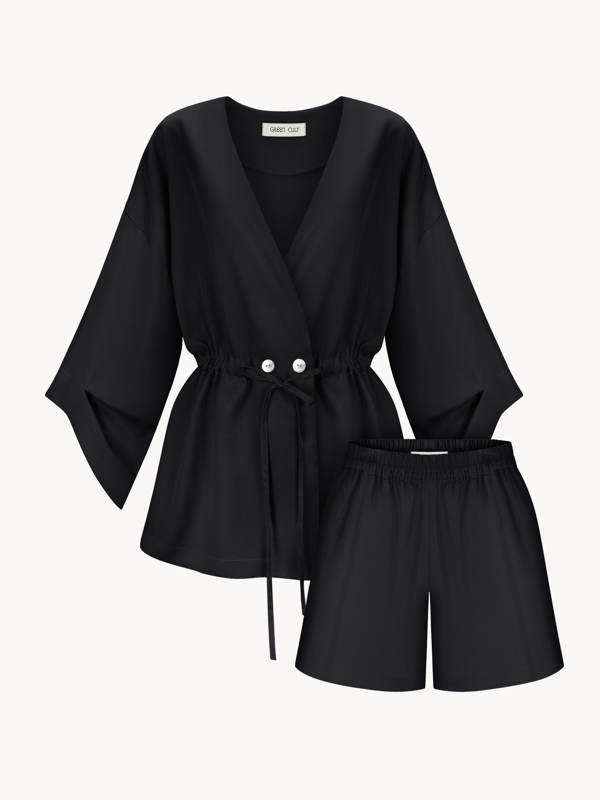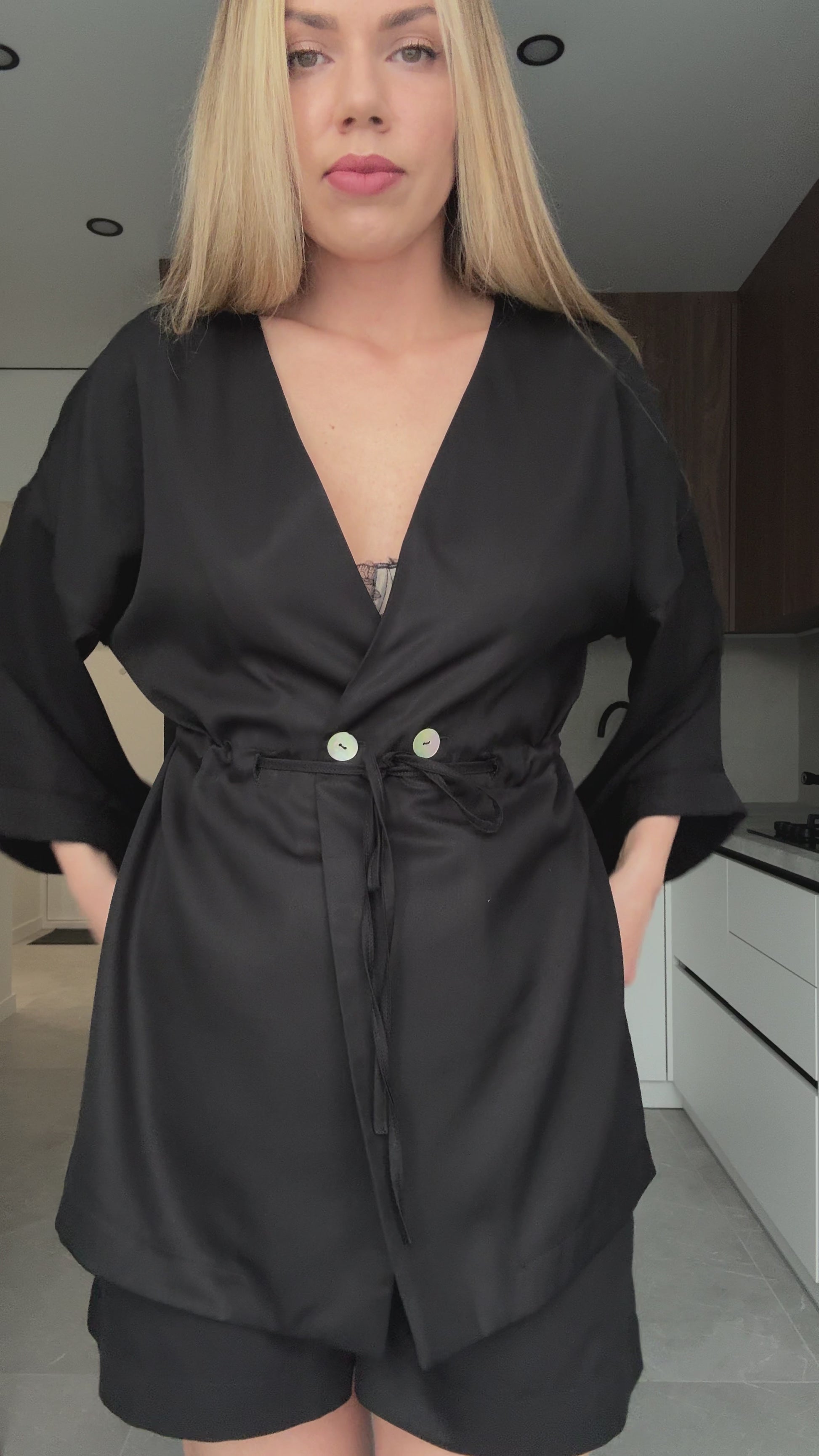Eucalyptus kimono set in black, adorned with mother-of-pearl buttons made from natural shell. Can be worn loose like a blazer without lining, or tailored for a more fitted kimono look. The set includes a kimono and shorts with pockets and an elastic waistband.