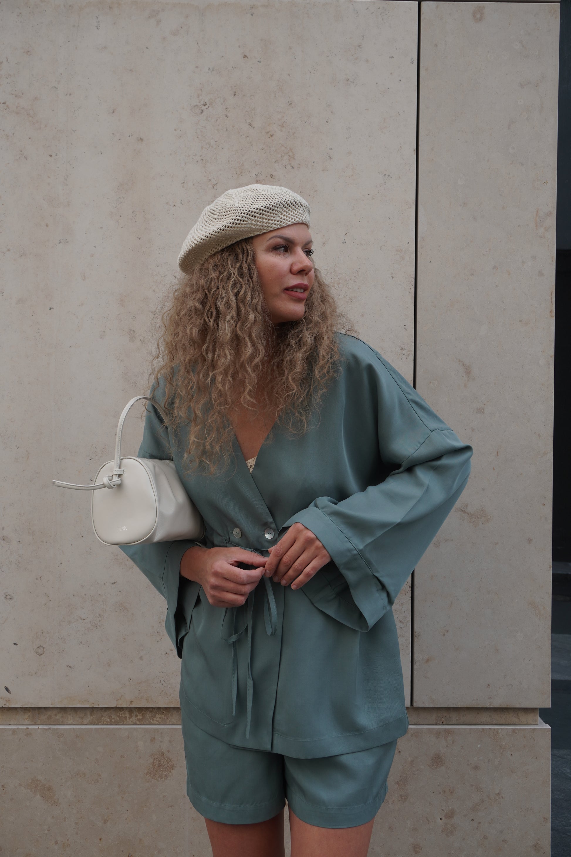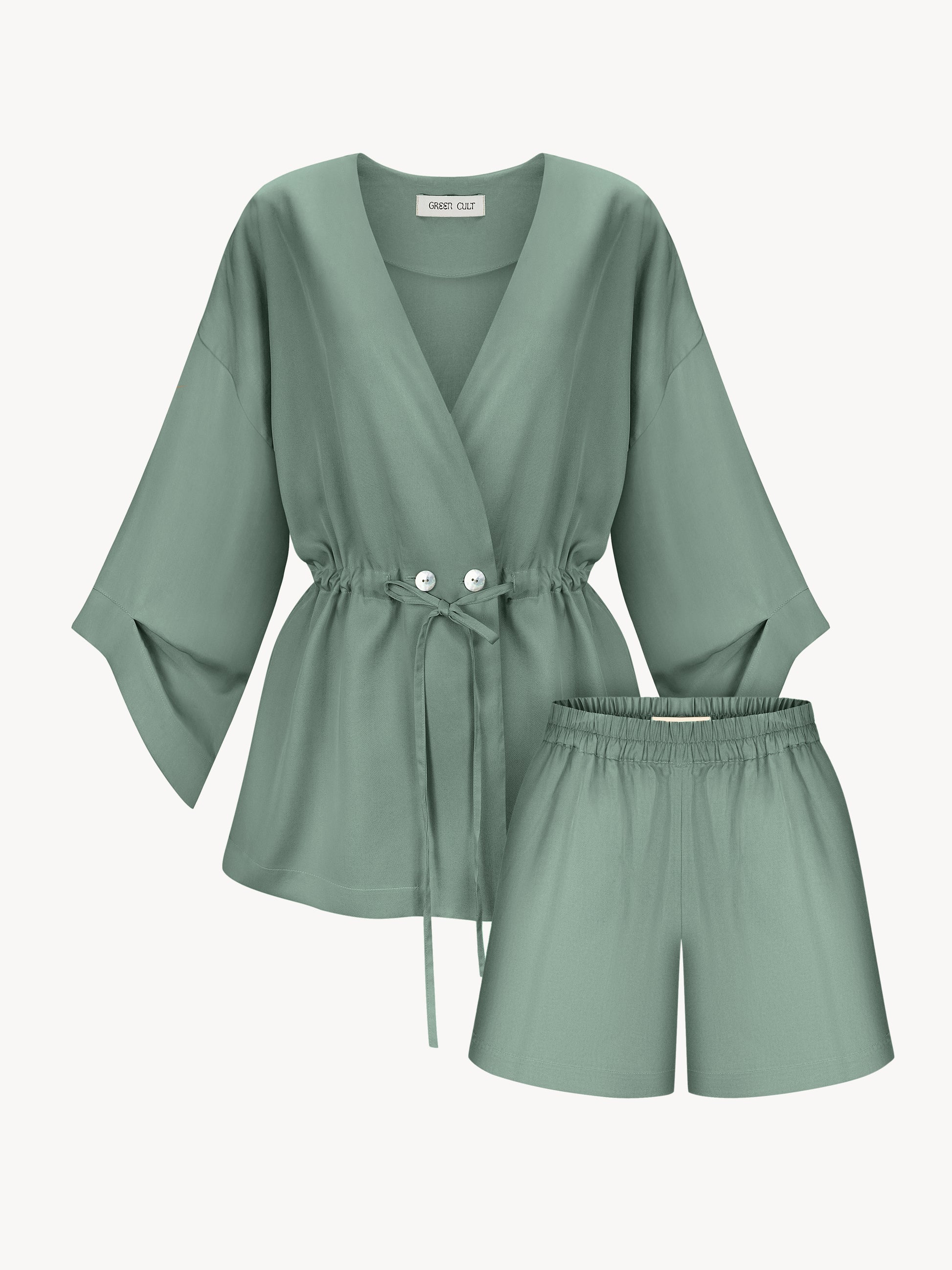 Eucalyptus kimono set in eucalyptus green, adorned with mother-of-pearl buttons made from natural shell. Can be worn loose like a blazer without lining, or tailored for a more fitted kimono look. The set includes a kimono and shorts with pockets and an elastic waistband.
