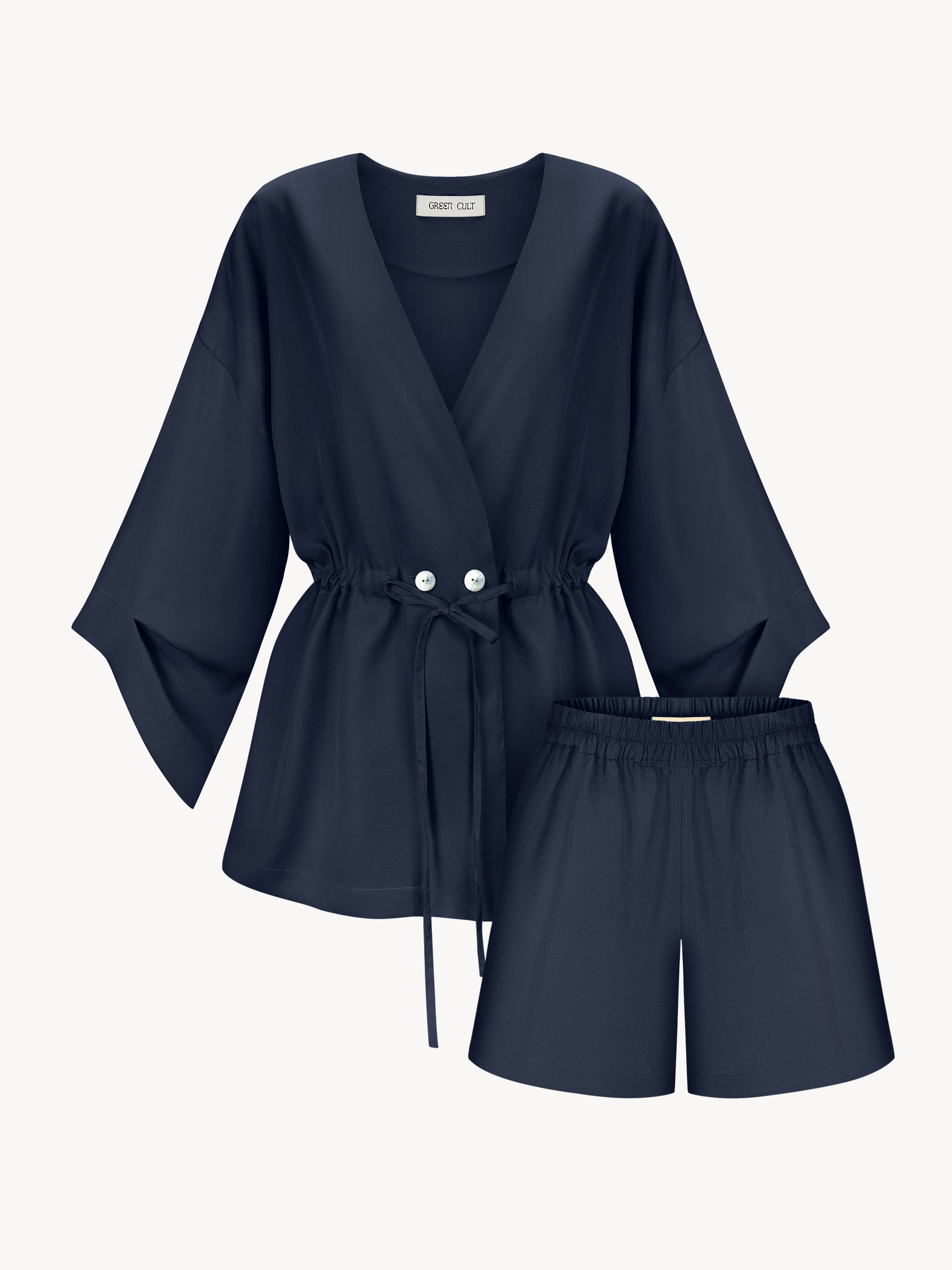 Eucalyptus kimono set in blue, adorned with mother-of-pearl buttons made from natural shell. Can be worn loose like a blazer without lining, or tailored for a more fitted kimono look. The set includes a kimono and shorts with pockets and an elastic waistband.