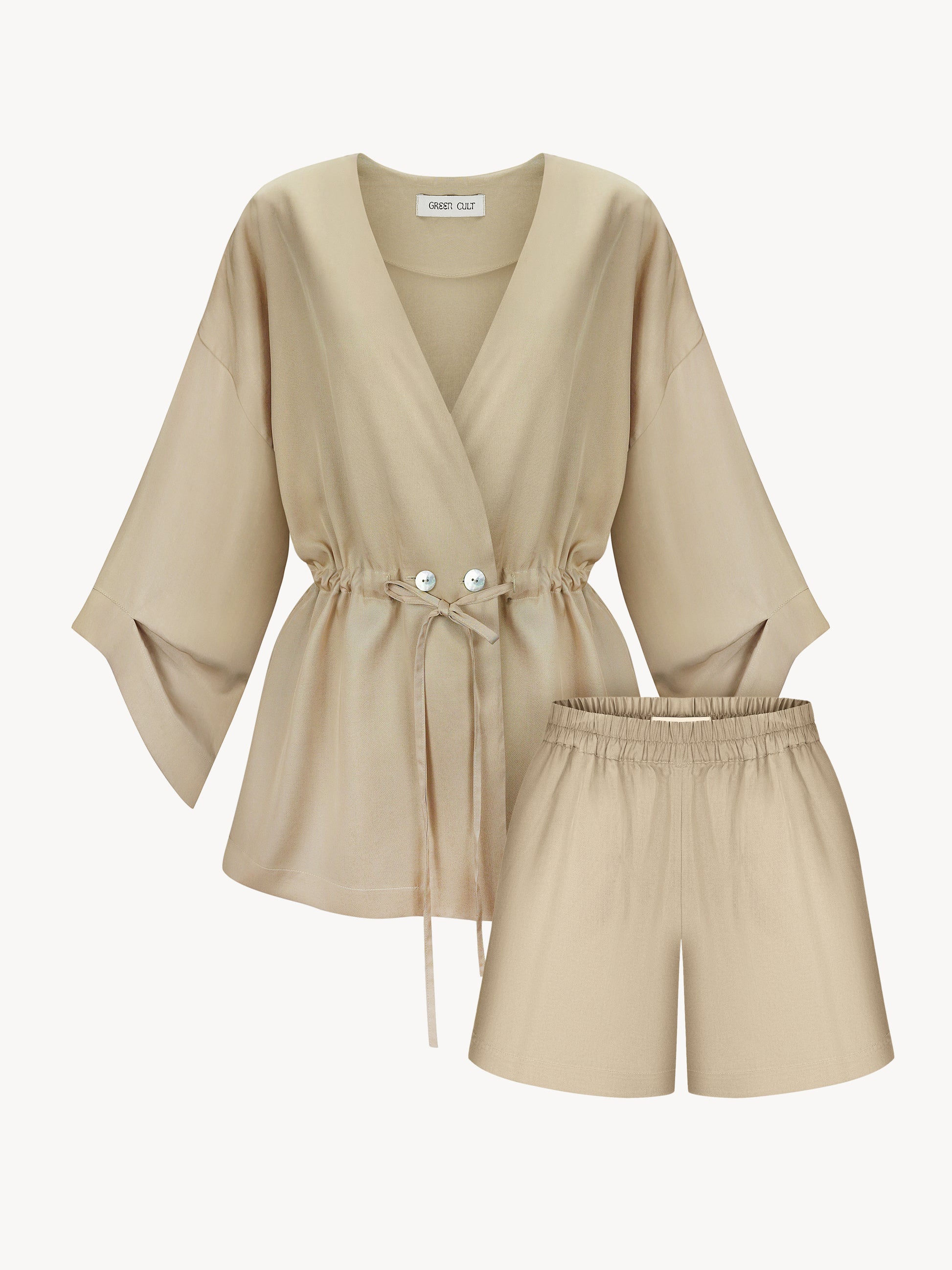 Eucalyptus kimono set in nude, adorned with mother-of-pearl buttons made from natural shell. Can be worn loose like a blazer without lining, or tailored for a more fitted kimono look. The set includes a kimono and shorts with pockets and an elastic waistband.