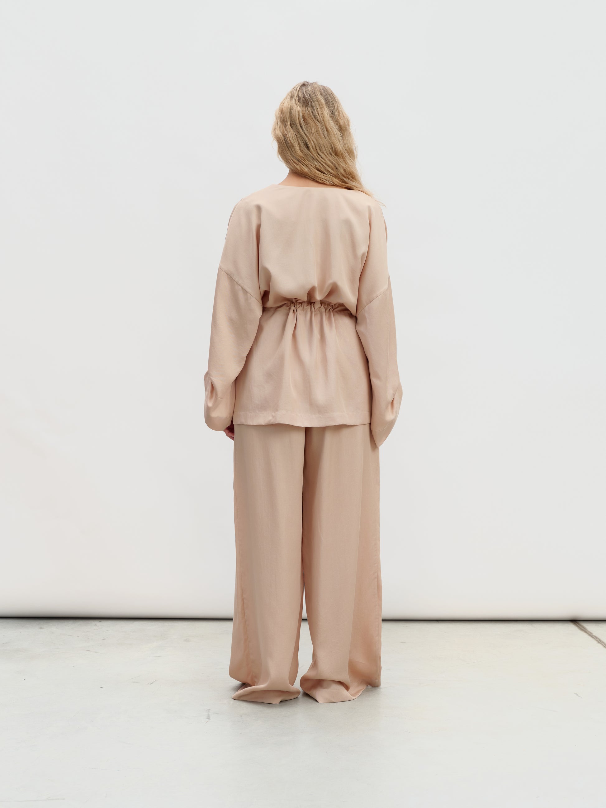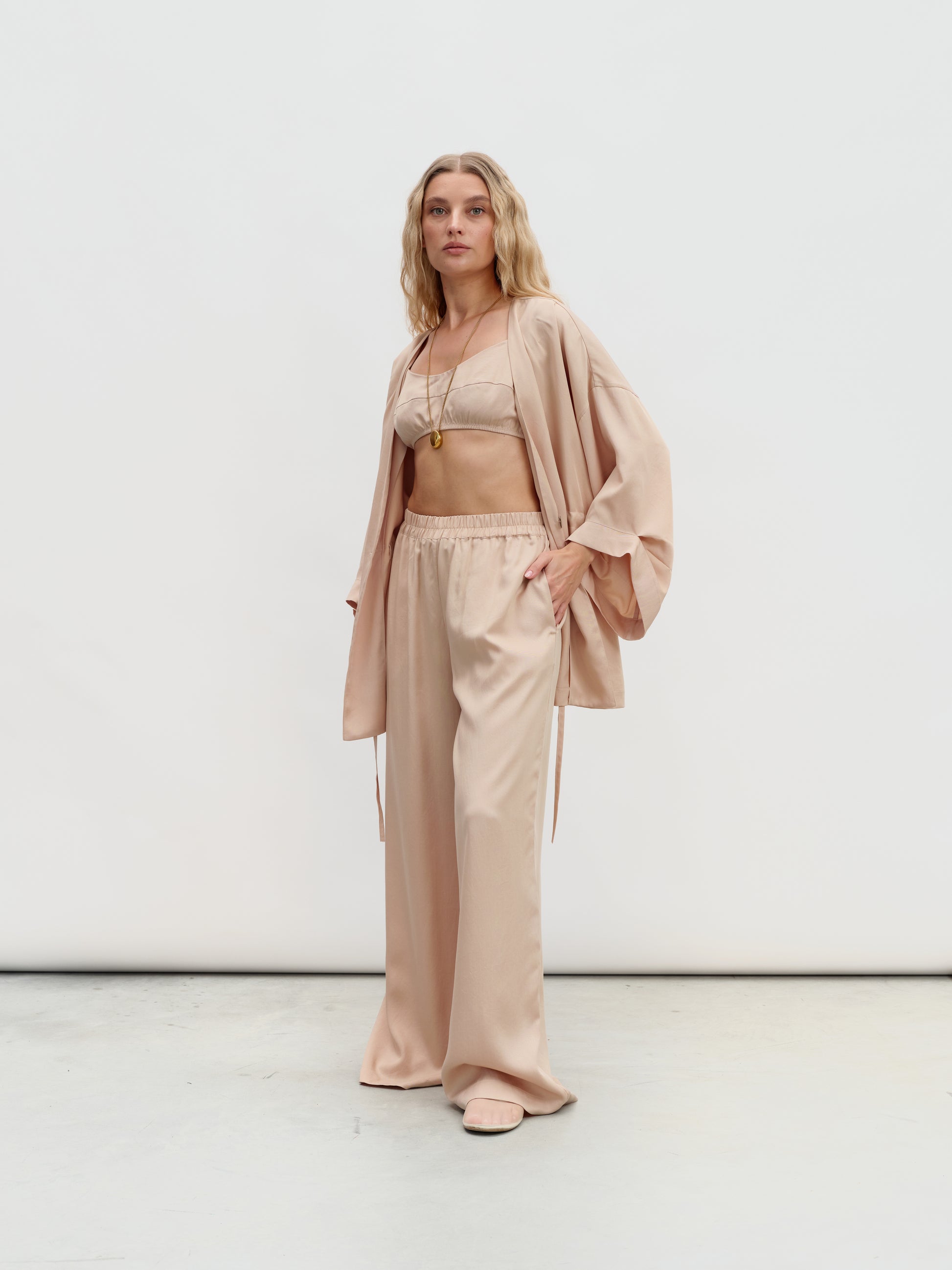 Eucalyptus kimono set in sand color, decorated with natural mother-of-pearl buttons. Can be worn loose like an unlined blazer or cinched at the waist like a kimono. The set includes a kimono and trousers with pockets and an elastic waistband.