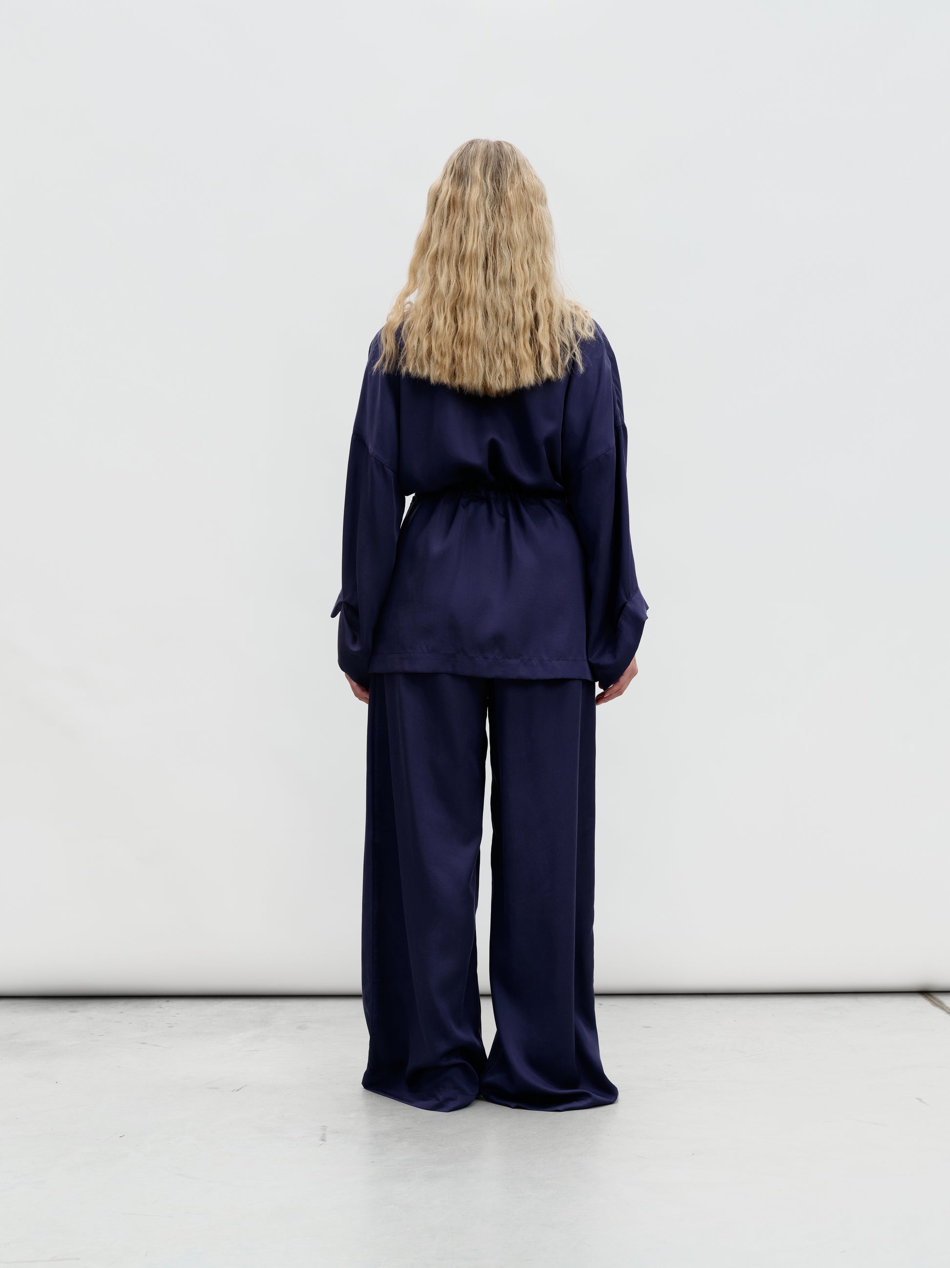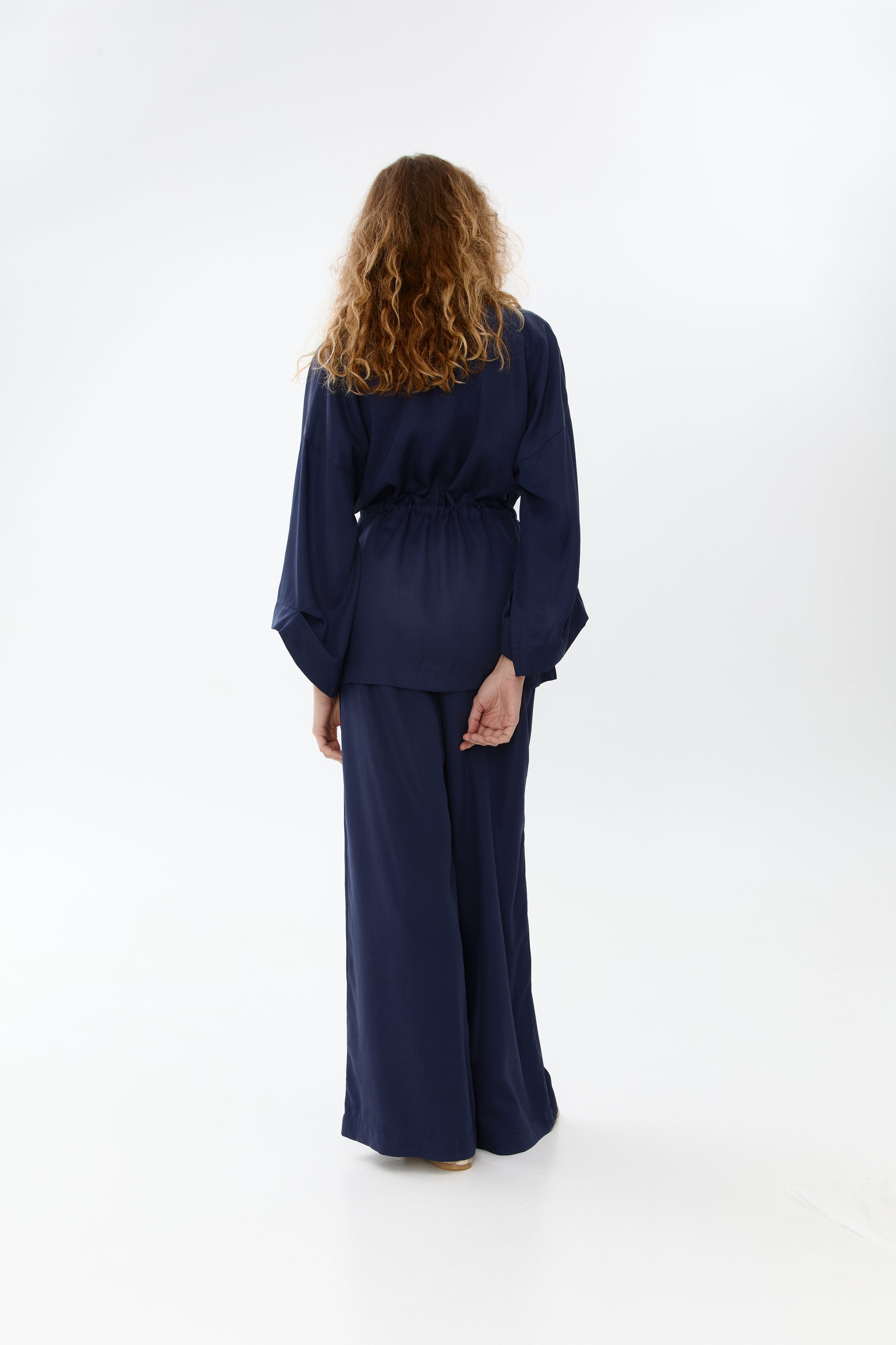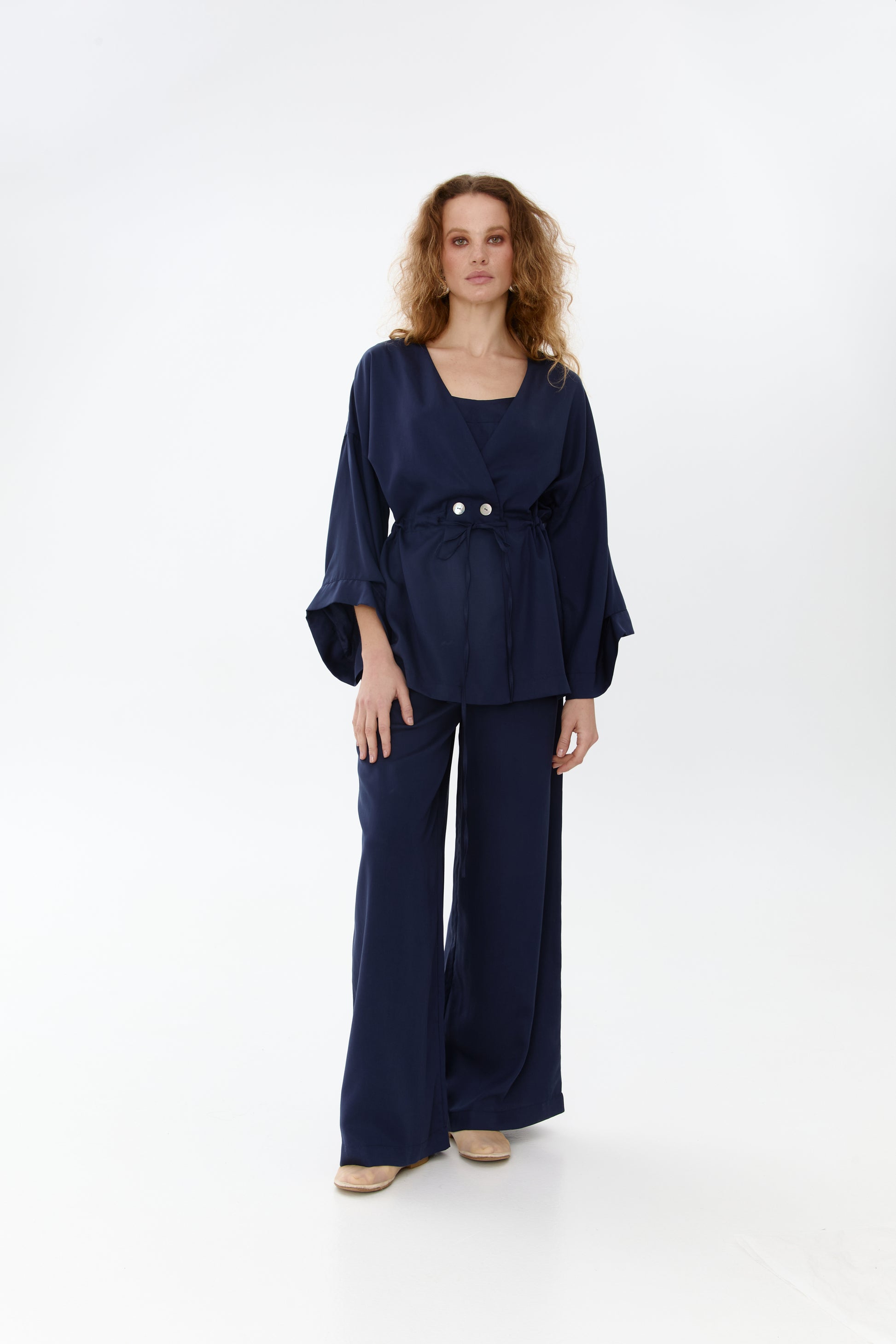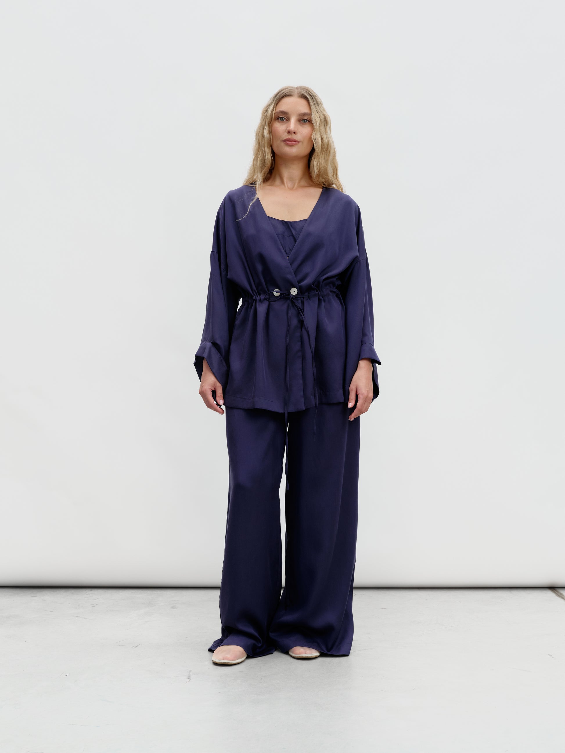 Kimono set in blue color, decorated with natural mother-of-pearl buttons. Can be worn loose like an unlined blazer or cinched at the waist like a kimono. The set includes a kimono and trousers with pockets and an elastic waistband.