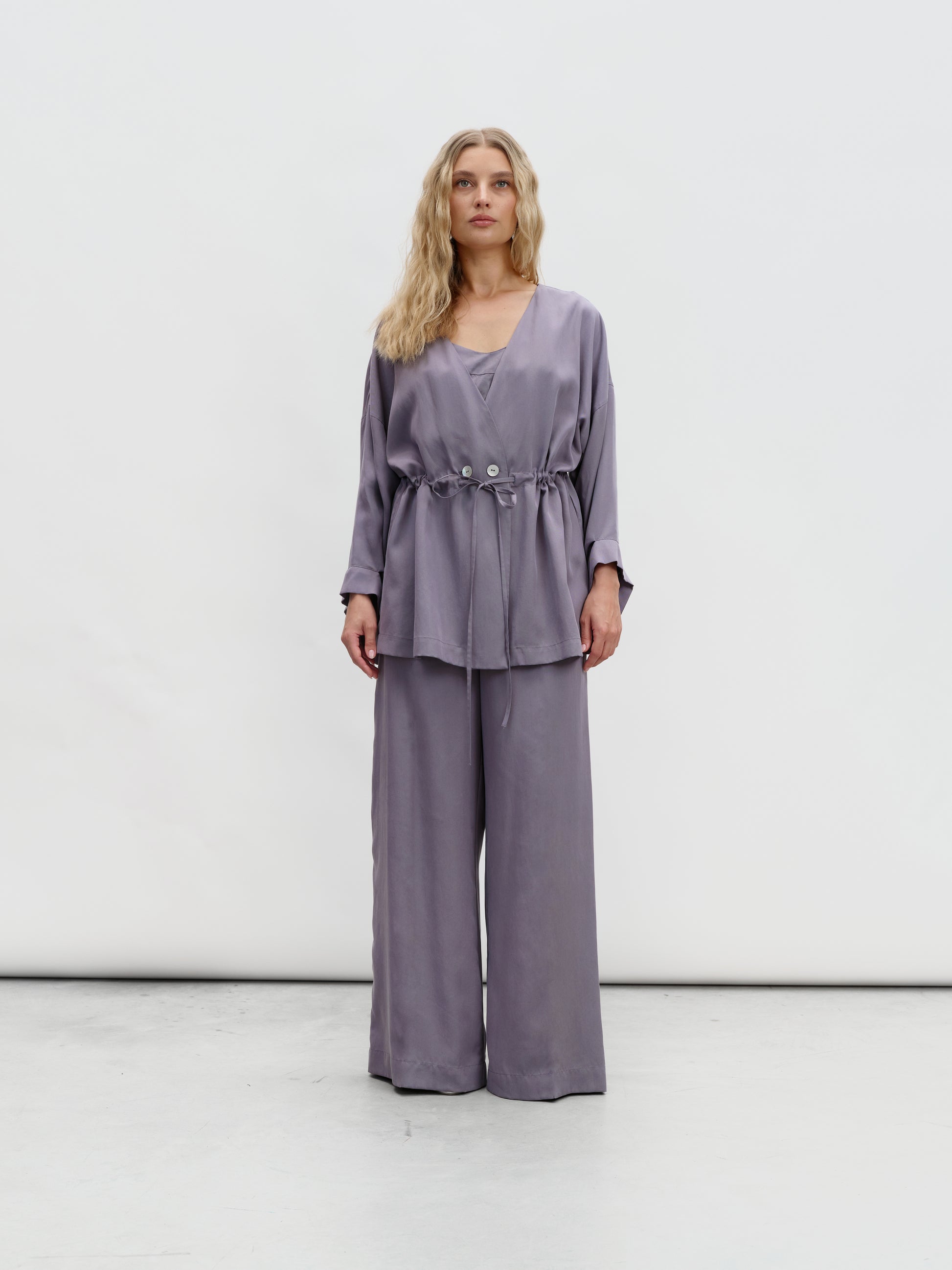 Kimono set in graphite color, decorated with natural mother-of-pearl buttons. Can be worn loose like an unlined blazer or cinched at the waist like a kimono. The set includes a kimono and trousers with pockets and an elastic waistband.