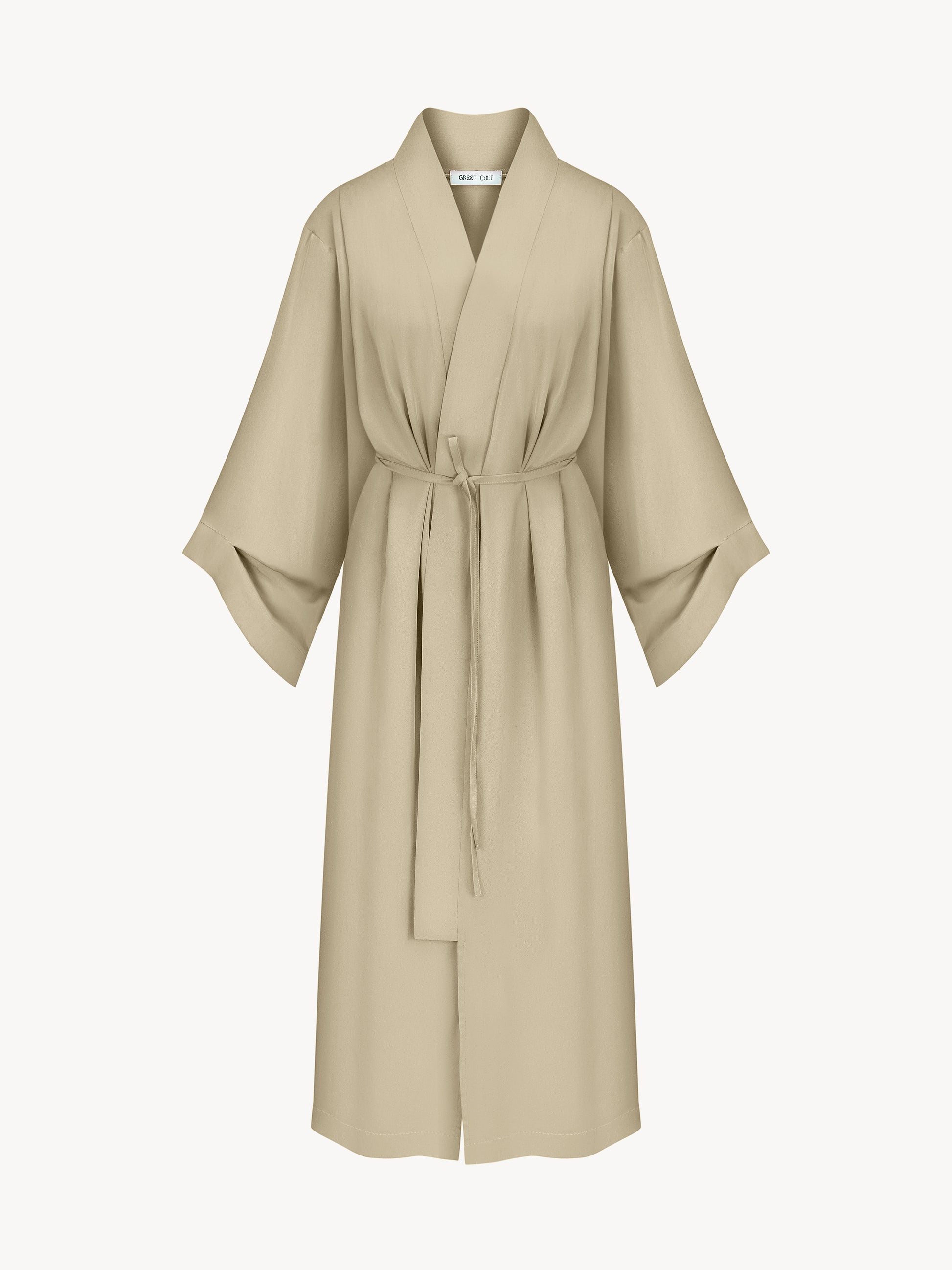 Евкаліптове кімоно в бежевому кольорі на запах, з акцентними плечима та рукавами із присборкою. Можна носити з поясом двома способами: повністю по зовнішній стороні виробу, чи залишити задню частину вільною. Пояс в комплекті.